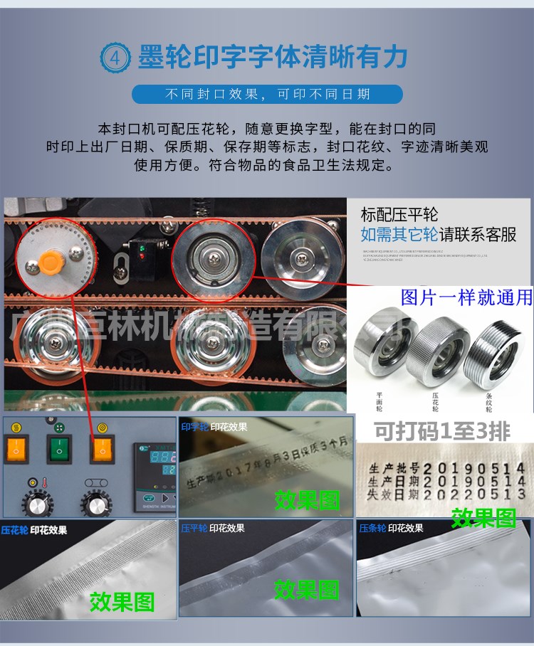本機(jī)是新一代集印碼,封口,連續(xù)輸送為一體的自動(dòng)薄膜封口機(jī),具有印字清晰、顔色可選、即印即干、換字方便等特點(diǎn)。