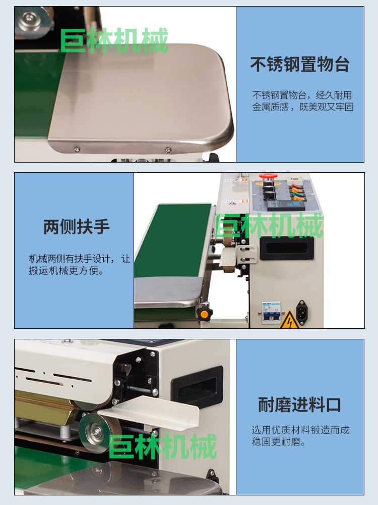 本機(jī)是新一代集印碼,封口,連續(xù)輸送為一體的自動薄膜封口機(jī),具有印字清晰、顔色可選、即印即干、換字方便等特點(diǎn)。
